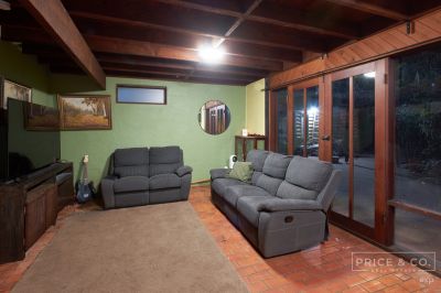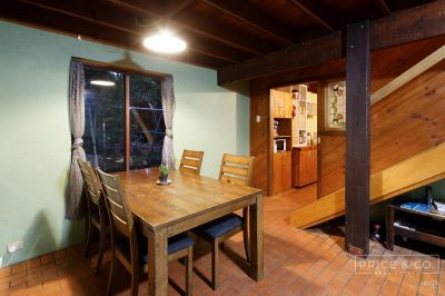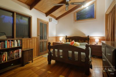 The functional timber kitchen flows out to an open-plan living and dining area, which features exquisite timber features and seamlessly leads onto a north-facing outdoor space where you can enjoy the soothing sounds of nature and breathtaking views of the surrounding greenery.